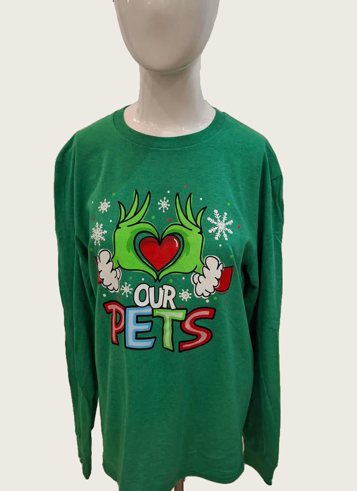 🎄 “Love Our Pets” Long-Sleeve AWL Holiday Grinch TeeShow your holiday spirit and your love for animals with this festive long-sleeve tee!